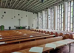 Zur Ausstattung gehört ein Wandteppich, der nach einem Entwurf von Woldemar Winkler von dessen Frau Margret Horstkotte-Winkler gewebt wurde und das Guter-Hirte-Motiv aufgreift.