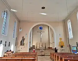 Von Klaus Backmund wurden der Altar , das Tabernakel rechts des Chorraums und die Kreuzwegstationen an den Längswänden des Kirchenraums geschaffen. Hinter dem Altar hängt ein großes Kruzifix von Matthias Bayerl (1956), der ebenfalls die Marienstatue links des Chorraums und die Josephsstatue im Kirchenraum gefertigt hat. Über dem Kruzifix ist mittig in der Kirchenwand ein rundes Buntglasfenster von Arno Bromberger (1970) eingelassen, welches die fünf Wundmale Christi zeigt. Über dem Tabernakel ist ein Wandbild des himmlischen Jerusalems von Ernst Strom (1995) angebracht, welches Symbole aus der Offenbarung des Johannes wie etwa den Baum des Lebens und das Wasser des Lebens aufnimmt. Ambo und Altarleuchter wurden im Jahr 1995 von Manfred Bergmeister gefertigt.[ 1]