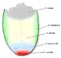 - Topologische Besonderheiten der Zunge: In Anlehnung an eine Körperrepräsentation auf der Zunge soll sich durch besondere Veränderungen Aufschluss über den Zustand einzelner Funktionskreise (Orbes) gewinnen lassen können.