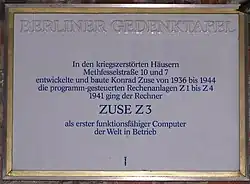 Die Z3 war einer der ersten funktionsfähigen Digitalrechner weltweit und wurde am 12. Mai 1941 von Konrad Zuse in seiner Werkstatt in der Methfesselstraße 7 in Berlin-Kreuzberg vorgestellt.[1] Zuse hatte ihn ab 1938 in Zusammenarbeit mit Helmut Schreyer in Berlin konstruiert. Die Z3 wurde in elektromagnetischer Relaistechnik mit 600 Relais für das Rechenwerk und 1400 Relais für das Speicherwerk ausgeführt.[2] Die Z3 verwendete (wie auch bereits die Z1) die von Konrad Zuse in die Rechnertechnik eingeführte binäre Gleitkommaarithmetik. Im Gegensatz zum Entwurf und der Benutzung des ENIAC genügte der Entwurf der Z3 nicht der späteren Definition eines turingmächtigen Computers und wurde auch nie so genutzt. Erst nach dem Tod des Erfinders Konrad Zuse am 18. Dezember 1995[3] fand man 1998 heraus, dass sie rein theoretisch gesehen durch trickreiche Nutzung aufwendiger Umwege dennoch diese Eigenschaft hatte.[4][5] Die Z3 gilt als erster funktionsfähiger Universalrechner der Welt.[6] Sie ist auch der erste Rechner, der umgekehrte polnische Notation (UPN) nutzte (allerdings noch nicht so benannt). Die Maschine wurde am 21. Dezember 1943 bei einem Bombenangriff zerstört.
