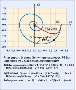 - Sind z. B. für ein PT2-Schwingungsglied mit der Dämpfung die Eingangsgröße und die Anfangswerte und gegeben, dann verläuft die Bahnkurve (Phasenporträt) als Funktion der Zeit in dem x1-x2-Diagramm entsprechend der Eigenbewegung des Systems von einem Anfangswert spiralförmig (typisch für ein Schwingungsglied) zum Ursprung Null () nach endlicher, genügend langer Zeit.