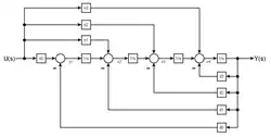 Jede Ableitung der Ausgangsgröße wird einer Integration unterzogen. Jede Zustandsgröße wird mit dem zugehörigen Koeffizienten auf den Eingang zurückgeführt und von der Eingangsgröße subtrahiert.