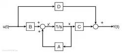 Die Zustandsraumdarstellung ist eine von mehreren bekannten Formen der Systembeschreibung eines linearen zeitinvarianten Übertragungssystems. Das Zustandsraummodell gilt als ingenieurtechnisch geeignete Methode der Analyse und Synthese dynamischer Systeme im Zeitbereich und ist besonders effizient bei der regelungstechnischen Behandlung von Mehrgrößensystemen, nichtlinearen und zeitvariablen Übertragungssystemen. Dabei werden sämtliche Beziehungen der Eingangs-, Ausgangs- und Zustandsgrößen in Form von Matrizen und Vektoren dargestellt.[1] Das Zustandsraummodell wird durch zwei Gleichungen beschrieben, die Zustandsdifferenzialgleichung erster Ordnung und die Ausgangsgleichung.