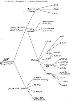 - ↑ bestehend aus dem „Deutschen Alpenkorps“, der „Deutschen Jägerdivision“ und der 22. (k.k.) Schützendivision