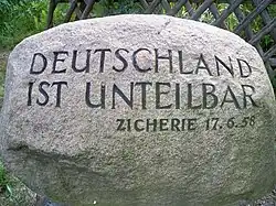 - Böckwitz, Stadtteil von Klötze, um 1952 Zwangsumsiedlungen und einige Häuser abgerissen, ehem. Doppeldorf Böckwitz-Zicherie, Gedenkstein von 1958 in Zicherie und Grenzlehrpfad in Böckwitz, Altmarkkreis Salzwedel