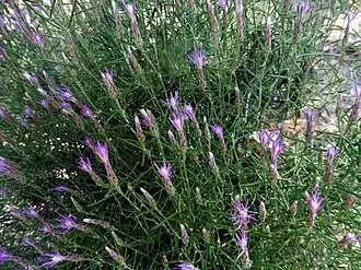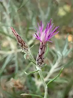 Die Blütezeit reicht von Juni bis Juli. Die wenigblütigen Blütenkörbe sind sehr schmal und stehen endständig einzeln oder zu zweit bis viert in trugdoldigen Gesamtblütenständen. Die Hülle ist 1,5 bis 2 Zentimeter lang und 3 bis 5 Millimeter breit. Die spitzen Hüllblätter sind dachziegelartig und röhrig angeordnet. Die Hüllblätter sind auf der Rücken zerstreut kurz filzig und rötlich umrandet. Die inneren Hüllblätter sind ganz rötlich überlaufen. Es sind fransige, zerschlitzte Spreublätter vorhanden. Die zwittrigen Röhrenblüten sind purpurfarben. Die Kronzipfel sind recht lang. Die Staubbeutel besitzen lange, fransige Anhängsel am Grund.[2]