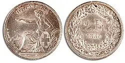 Zuvor bestand er aus Silber; von 1850 bis 1857 in einer Reinheit von 900/1000, von 1860 bis 1863 in einer Reinheit von 800/1000 und von 1874 bis 1967 in einer Reinheit von 835/1000. Die erste wurde 1869, die zweite 1878 und die letzte 1971 ausser Kurs gesetzt.[1] Die Silbermünze wog stets 10 Gramm, die Kupfernickelmünze hingegen nur noch 8,8 Gramm. Eine bemerkenswerte Tatsache ist, dass ein Zweifrankenstück schon immer genau so viel wie zwei Einfrankenstücke oder vier Fünfzigrappenstücke wiegt.