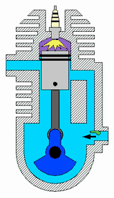 - Kurz vor dem oberen Totpunkt wird bei Ottomotoren das Brennstoff-Luft-Gemisch durch eine Zündkerze gezündet. Es verbrennt so schnell, dass der Kolben sich in der Verbrennungszeit wenig weiterbewegt, das Volumen bleibt etwa konstant (nahezu isochore Wärmezufuhr). Beim Diesel-Zweitaktmotor beginnt die Treibstoffeinspritzung kurz vor dem oberen Totpunkt. Die Verbrennung dauert etwas länger und der Druck bleibt annähernd gleich (isobare Wärmezufuhr). In beiden Fällen entsteht ein hoher Druck.