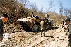Russische Soldaten mit einem Schützenpanzer vom Typ BTR-80