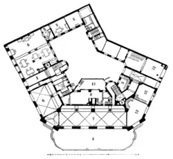 Nach seiner Fertigstellung beherbergte das Haus im Erdgeschoss an der Kurfürstendamm-Seite eine Depositenkasse der Dresdner Bank, an der Platzseite mit einer Außengastronomie-Terrasse die Café-Konditorei Kaiserhof der Berliner Hotel-Gesellschaft (als eine Art Filiale des berühmten Hotels Kaiserhof) und an der Tauentzienstraße drei kleinere Ladenlokale.[1] Während auf den im Herbst 1901 gedruckt veröffentlichten Fotos des Hauses die Fenster der Café-Konditorei die Aufschrift Conditorei Kaiserhof tragen,[1] nennt das Berliner Adressbuch für das Jahr 1902 bereits das Romanische Café,[4] das später unter Leitung des „Cafétiers“[2] Bruno Fiering zum bekanntesten Künstlertreff Berlins wurde. In den oberen Geschossen waren acht Wohnungen untergebracht,[1] die bei unterschiedlicher Größe jedoch alle auf wohlhabende Mieter zugeschnitten waren – wie im ganzen Quartier ringsum.