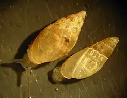 Mäuseöhrchen (Myosotella myosotis) (links) und Zweizahn-Küstenschnecke (Leucophytia bidentata) (rechts)