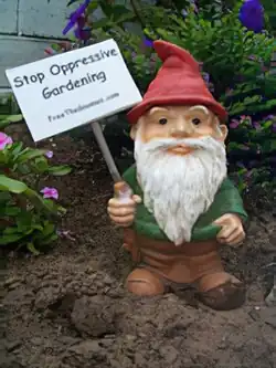 Im Rahmen der Auseinandersetzung mit „nationalen Symbolen“ seit der Deutschen Wiedervereinigung nahm aber auch das Interesse an Gartenzwergen wieder zu, besonders an ironischen und satirischen Darstellungen, etwa Zwergen in obszönen oder provozierenden Posen, oder als Karikaturen bekannter Politiker. Einen ähnlich satirischen Anspruch verfolgte wohl auch die Front zur Befreiung der Gartenzwerge, deren Anhänger die Figuren aus Vorgärten „befreiten“, um sie dann in ihrem „natürlichen Lebensraum“ (Wäldern usw.), wieder auszusetzen. Werden Gartenzwerge mit beleidigender Absicht aufgestellt, so kann der Geschädigte die Entfernung der Skulptur verlangen, und die „Befreiung“ eines Gartenzwerges kann als Diebstahl geahndet werden.