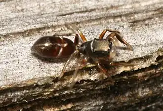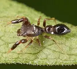 Zwergameisenspringer sind kleine Springspinnen (Salticidae) mit einer Körperlänge von 2,2 bis 4,8 Millimetern.[1] Typisch ist für diese Spinnen der langgestreckte, schillernde Körper, wodurch das ameisenähnliche Erscheinungsbild ermöglicht wird.[2] Zwergameisenspringer sind gleichmäßig dunkel- bis hellbraun, die Beine blass gefärbt und haben pro- (vorne) und retrolateral (hinten seitlich) dunkle Streifen und verdunkelte Flächen.[1]