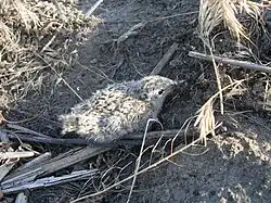 Die Küken schlüpfen gewöhnlich in einem kurzen Zeitraum, oft innerhalb von 24 Stunden[38], wobei sie ein Gewicht von etwa 7 g aufweisen.[7] Die Altvögel entsorgen sofort die Eischalen in ausreichender Entfernung, da sonst durch deren sichtbare weiße Innenseite die Tarnung des Nests beeinträchtigt wäre. Beim Schlupf sind die Küken blind und nur teilweise mit Daunenfedern bedeckt, die einen Tag später den gesamten Körper bedecken.[40] In den ersten zwei bis drei Tagen werden sie fast ohne Unterbrechung vom Weibchen gehudert, wobei dieses seine Flügel ausbreitet, sodass die Küken sich unter den Flügeln in den Boden graben können. Später tritt Hudern nur noch selten auf, wenngleich es bei schlechtem Wetter sogar bei über 20 Tage alten Jungvögeln beobachtet werden konnte.[7]