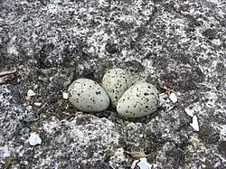 Sobald sich ein Paar gefunden hat, verstärkt sich das Balzverhalten immer mehr, bis es schließlich zur Paarung kommt.[40] Die Partner scharren an verschiedenen Stellen herum, bis sie einen geeigneten Neststandort gefunden haben.[38] Dieser muss über der Hochwasserlinie liegen, ist aber meist nur wenige Meter vom Wasser entfernt und normalerweise zu weniger als 15 % von Vegetation bedeckt. Meist besteht das Nest nur aus einer kleinen Mulde im Boden, in stärker bewachsenen Habitaten wie Salzwiesen wird es manchmal mit Muschelstücken und Pflanzenteilen ausgekleidet.[19] Das Gelege besteht meist aus zwei oder drei Eiern. Je später in der Brutsaison die Eiablage stattfindet, desto geringer ist deren Anzahl, sodass bei sehr später Eiablage teilweise nur ein Ei gelegt wird, was zu Beginn der Brutzeit nahezu nie vorkommt. Normalerweise werden die Eier auf mehrere, manchmal direkt aufeinanderfolgende Tage verteilt gelegt.[38] Die Eier sind durch ihre leder- bis olivfarbene oder blass grünlichgraue Färbung[39] gut getarnt und auf dem Boden schwer zu entdecken.[40] Sie haben zahlreiche schwarze, variabel braune oder lavendelfarbene Flecken sowie aschfarben oder violett unterlegtes Gekritzel hauptsächlich am dickeren Ende. Ein einzelnes Ei misst durchschnittlich 29,9 × 22,6 mm und wiegt 8–11 g, wie Messungen in Westafrika ergaben.[39]