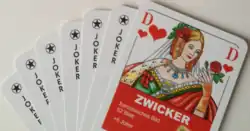 Ursprünglich wurden in diesem Spiel keine Joker verwendet, aber heute ist es eines der wenigen Spiele, das mit bis zu sechs Jokern in einem einzigen Paket gespielt wird. Ab den 1950er Jahren wurden zu diesem Zweck spezielle Zwicker-Pakete hergestellt, zunächst von ASS Altenburger und später auch vom NSV. Letztere Firma produzierte sie bis etwa 2020. Heute sind sie nicht mehr erhältlich und man braucht zwei Pakete Standardkarten mit jeweils 3 Jokern und dem gleichen Rückseitendesign, um die Versionen mit 4 bis 6 Jokern spielen zu können. Wo Joker verwendet wurden, spielen sie eine wichtige Rolle im Spiel und sind normalerweise die wertvollsten Zählkarten. Ein Großteil der Literatur folgt Hülsemann darin, dass keine Joker verwendet werden;[20] bei Grupp und Parlett sind sie optional;[9][3] aber in der Praxis beinhalten alle Berichte von echten Spielern die Verwendung von Jokern, auch wenn ihre Werte variieren.