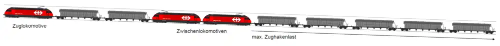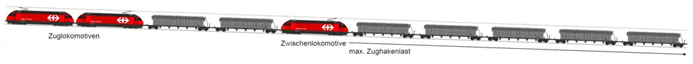- ↑ Weil laut Schweizer Fahrdienstvorschriften eine Zwischenlokomotive keine Stoßkräfte ausüben darf, benötigt ein Zug mit einer Zwischenlokomtive in jedem Fall eine Zuglokomotive.