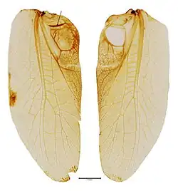 Linker und rechter Vorderflügel eines adulten Männchens. Die Flügelfläche wird hauptsächlich vom Lateralfeld gebildet, während das Dorsalfeld ein Dreieck mit dem Stridulationsorgan darstellt. Der Pfeil zeigt auf die aktive Schrillleiste. Die Farbe änderte sich durch die Präparation.