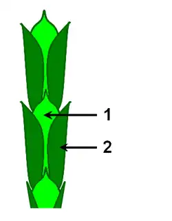 Ein gemeinsames Kennzeichen sind die Blattorgane, die als Nadel- oder Schuppenblätter ausgebildet sind. Oft sind junge Triebe völlig von den kreuzweise gegenständigen oder wirtelig angeordneten, schuppenförmigen Blattorganen verdeckt. Dabei werden die seitlich liegenden Kantenblätter von den an der Ober- und Unterseite liegenden Flächenblättern unterschieden (siehe schematische Darstellung). Flächen- und Kantenblätter können sich sowohl in Größe als auch in Form unterscheiden.[2] Keimlinge haben zwei bis fünf Keimblätter (Kotyledone), bei Taxodium sind es bis zu neun Keimblätter.